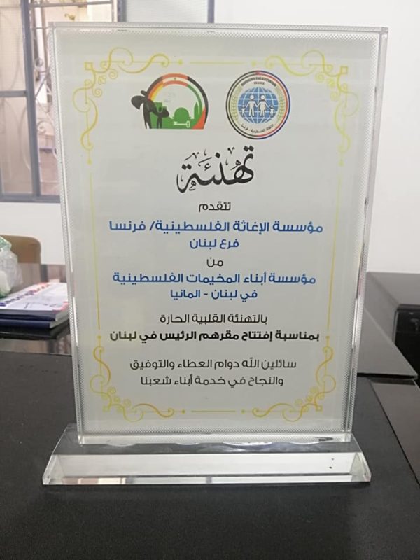Palestinian Relief / France – Lebanon Branch The Foundation for the Children of Palestinian Camps in Lebanon – Germany participates in the opening of its main branch in Ein El-Helweh camp, and offers a shield of congratulations to the Foundation and its team, asking God for them to continue giving, success and success in serving our people, thanking their efforts in alleviating the suffering of the needy And they take on the daunting task