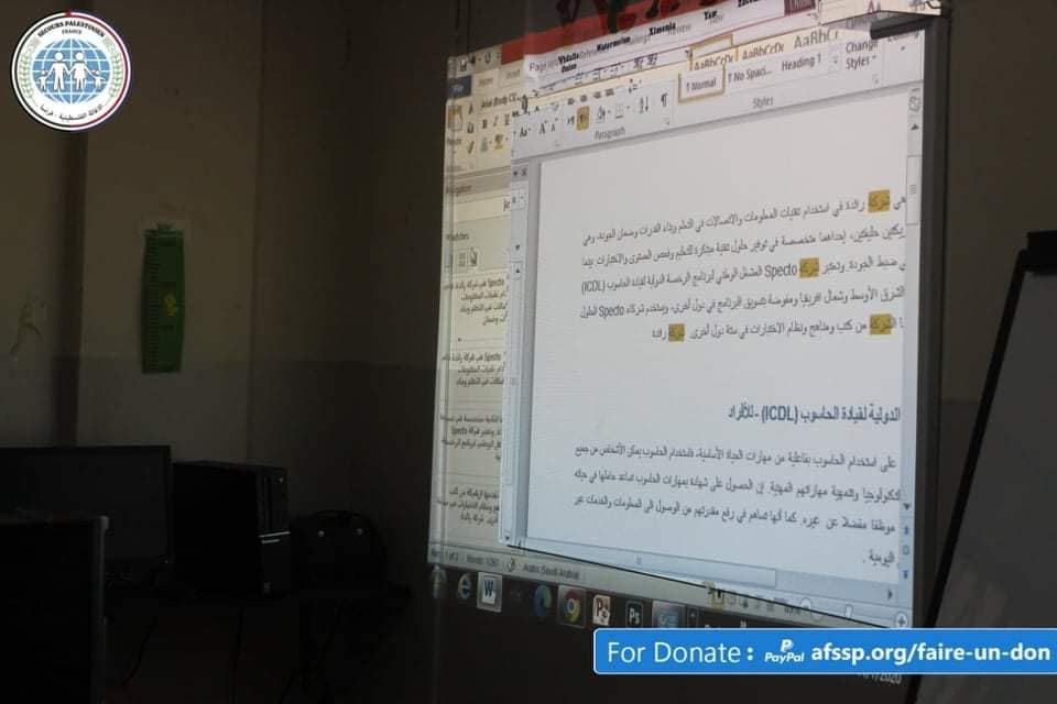 Hasnat İnsani Gelişme İçin Yardımsever, Filistin Yardımından-Fransa’dan fon alarak, Ain El-Helweh kampındaki (Bilgisayar Sürüş Becerileri ICDL) gençlere yönelik bir eğitim kursu düzenledi. Bu kurs, genç mültecilere yeteneklerini ve becerilerini toplumun zararlılarından uzakta geliştirmeleri için sağladığı eğitim ve öğretim programlarının bir parçasıdır.